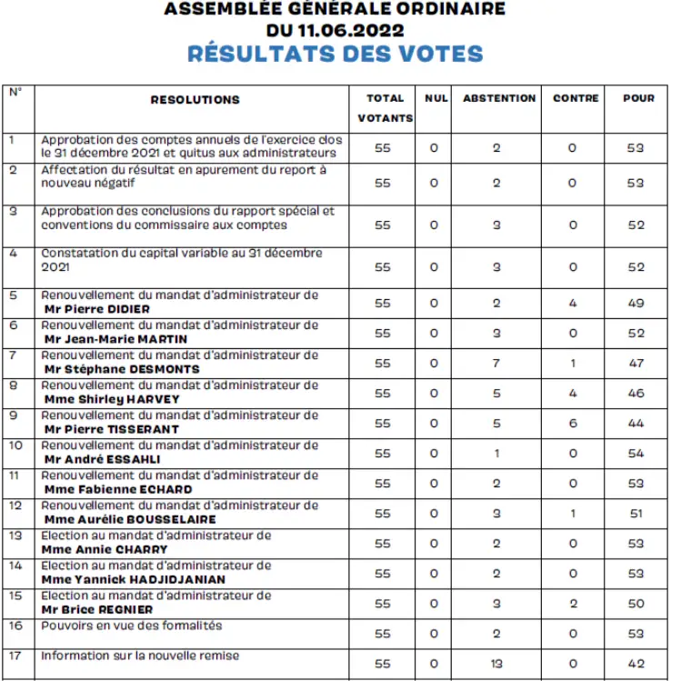 Voici les résultats de vos votes. Toutes les résolutions ont été largement adoptées : merci pour votre confiance !